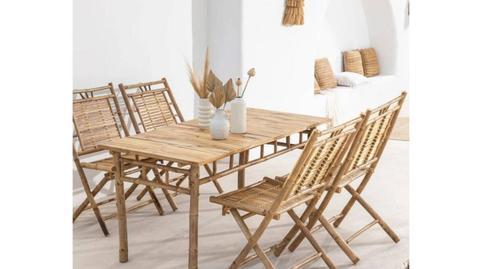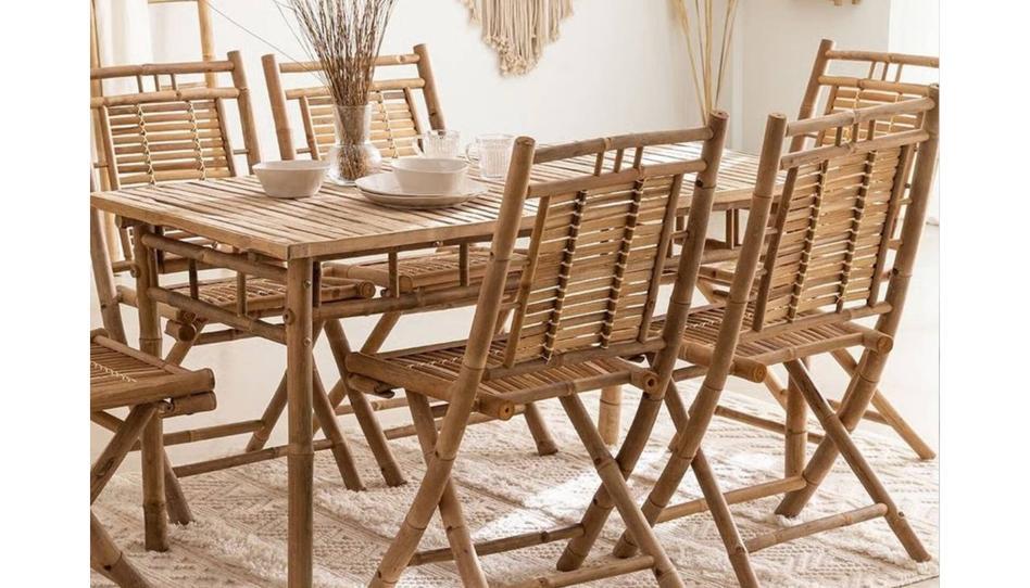 *4 sillas Silla plegables en bambú Yakku. Silla de comedor plegable en bambú Yakku. Las Sillas plegables en bambú Yakku crea un ambiente fresco y natural. Con un diseño cuidadosamente elaborado, esta silla destaca por su estilo rústico y acogedor. Su estructura está fabricada en bambú de alta calidad, aportando una estética ligera y resistente. El asiento y el respaldo ofrecen una comodidad sorprendente debido a la flexibilidad y adaptabilidad de su material. Las líneas sencillas y la cálida tonalidad del bambú hacen que esta silla sea un complemento versátil, capaz de integrarse con facilidad en diversas decoraciones. Al ser plegable, puedes guardarla sin ocupar espacio y sacarla solo