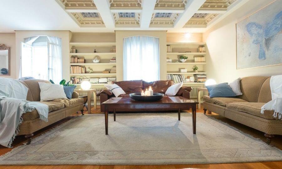 Main floor with a spectacular living room featuring a beautiful coffered ceiling, a large kitchen, and a dining area.
