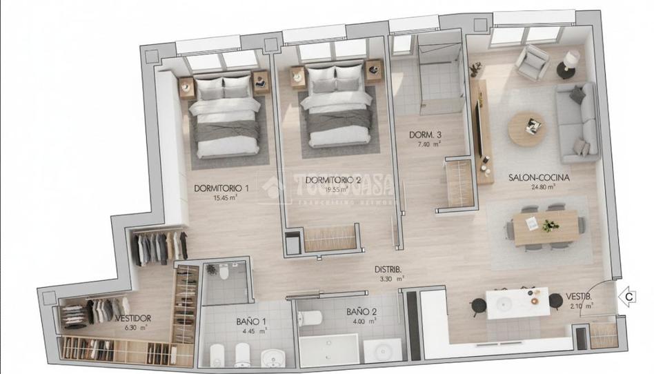Fantástica vivienda de tres dormitorios, dos baños, vestidor, cocina y con una superficie bien aprovechada, destaca su amplio salón-comedor, perfecto para disfrutar de reuniones y momentos en familia.