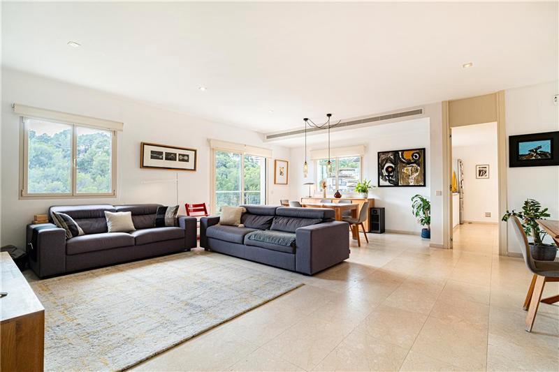 Apartment with terraces and partial sea views in a residential complex with a communal pool, approximately 172m², 2 living rooms totaling approximately 72m², a kitchen of approximately 50m² divided into two areas with direct access to the outdoor terrace, furnished and equipped kitchen, utility room, 4 spacious double bedrooms (2 with direct access to the terrace), fitted wardrobes, 2 full bathrooms (1 en suite), guest toilet, natural stone floors, double glazing, electric blinds and awnings, heating, hot and cold air conditioning, storage room, large parking space, covered terrace of 25m² + outdoor terrace of 40m², 2 communal swimming pools, surrounded by green areas with views of the forest and partial sea views. Building with few neighbors, very quiet and with a communal osmosis system.